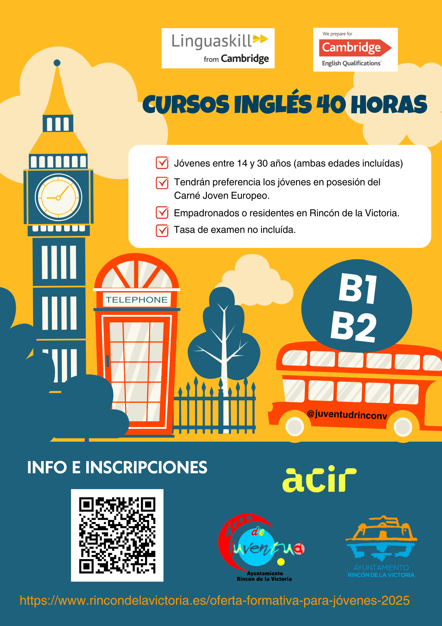 La Concejalía de Juventud del Ayuntamiento de Rincón de la Victoria ha organizado dos cursos formativos para el aprendizaje de la lengua inglesa, dirigidos a jóvenes con edades comprendidas entre los 14 y 30 años, con un total de 40 horas de duración cada uno, en los niveles B1 y B2, incluyendo las prácticas de exámenes. Las plazas disponibles son 20, que podrán repartirse en función de la mayor demanda, pudiendo convocarse dos cursos de diferente o igual nivel. Cada curso será de 10 alumnos por nivel obligatoriamente, pudiéndose convocar nivel B1 y B2, según las inscripciones recibidas.