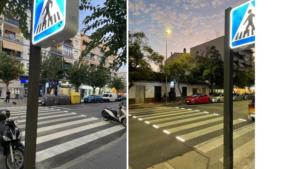 b) Instalación de pasos de peatones inteligentes iluminados en el suelo y con señalización vertical (8).