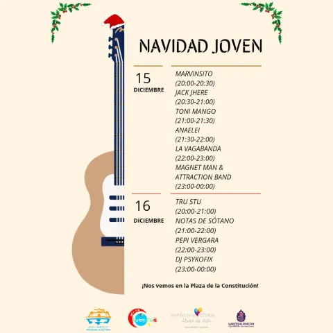 Los grupos que actuarán el viernes 15 de diciembre son Marvinsito (música urbana), Jack Jhere (rap conciencia), Toni Mango, (Flamenco Reggaeton), ANAELEI (música urbana), La Vagabanda (rock) y Magnet Man & Attraction Man Reggae).