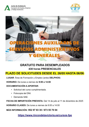 El Ayuntamiento de Rincón de la Victoria, a través del Área de Formación y Empleo, ha abierto el plazo de solicitudes para participar en dos nuevas acciones formativas gratuitas dirigidas a personas desempleadas, enmarcadas dentro del programa de Formación Profesional para el Empleo (FPE) financiado por la Consejería de Empleo, Empresa y Trabajo Autónomo de la Junta de Andalucía.