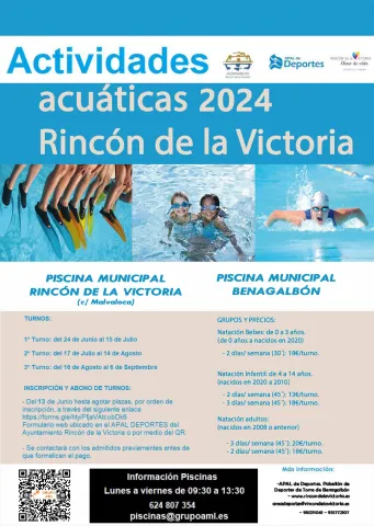 La Concejalía de Deportes del Ayuntamiento de Rincón de la Victoria abre el plazo de inscripciones a partir de las 00:00 horas del jueves 13 de junio para los cursos de natación en las piscinas municipales durante la temporada estival.