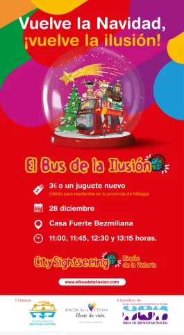 El próximo jueves 28 de diciembre, el Bus de la Ilusión de City Sightseeing recorrerá las principales calles de Rincón de la Victoria con el objetivo de recaudar juguetes que irán destinados a las familias más vulnerables del municipio a través de Bienestar Social.