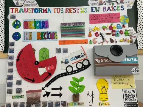 El alumnado ha elaborado un mural informativo y realista que ilustra claramente los tipos de residuos que deben depositarse en el contenedor marrón. El cartel incluye valiosa información sobre el tema y presenta fotografías de los estudiantes junto a los contenedores marrones.