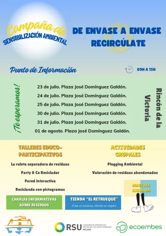 Las actividades y juegos se celebrarán los días 23, 24, 25, 30, 31 de julio, y 1 de agosto en horario de 09:00 a 15:00 horas en la plaza José Domínguez Galdón `Pepe El Boticario´. La campaña tiene como objetivo concienciar e implicar a los participantes en la prevención de residuos de envases, así como su correcta separación. La acción `De envase a envase, recircúlate´ está organizada por el Consorcio Provincial de Residuos de Málaga de la Diputación provincial, con el apoyo de ECOEMBES y las Áreas de Sostenibilidad Medioambiental y Playas del Ayuntamiento de Rincón de la Victoria