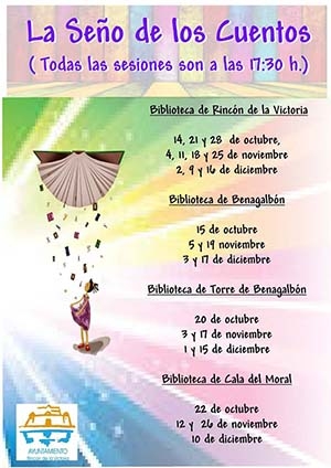 Vuelve la Seño de los Cuentos a las Bibliotecas del municipio para animar a la lectura a los más pequeños Las Bibliotecas de Rincón de la Victoria volverán a iniciar a partir de la semana el ciclo la Seño de los Cuentos, el ciclo de animación a la lectura para los más pequeños. La biblioteca Antonio de Hilaria como cada año contará con esta actividad cada miércoles, en Benagalbón este mes de octubre los días 6 y 20, en Torre de Benagalbón los días 11 y 25 y en La Cala los días 13 y 27. El ciclo comienza a las 17.30 horas.