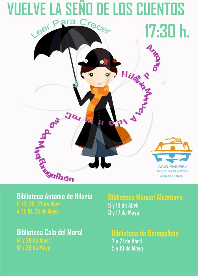 Vuelve la Seño de los Cuentos a las Bibliotecas del municipio para animar a la lectura a los más pequeños Las Bibliotecas de Rincón de la Victoria volverán a iniciar a partir de la semana el ciclo la Seño de los Cuentos, el ciclo de animación a la lectura para los más pequeños. La biblioteca Antonio de Hilaria como cada año contará con esta actividad cada miércoles, en Benagalbón este mes de octubre los días 6 y 20, en Torre de Benagalbón los días 11 y 25 y en La Cala los días 13 y 27. El ciclo comienza a las 17.30 horas.