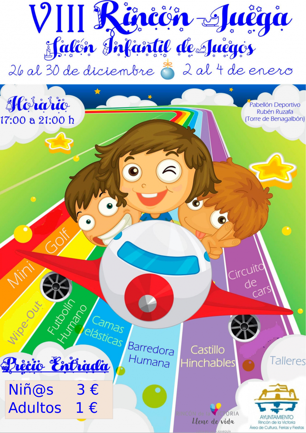 DEL 26 AL 30 DE DICIEMBRE Y DEL 2 AL 4 DE ENERO. Minigolf, Wipe out, Futbolín humano, Camas elásticas, Barredora humana, Castillos hinchables, Circuito de Cars, Talleres... Todo esto en el pabellón deportivo Rubén Ruzafa. Precio de la entrada Niños 3€, Adultos 1€