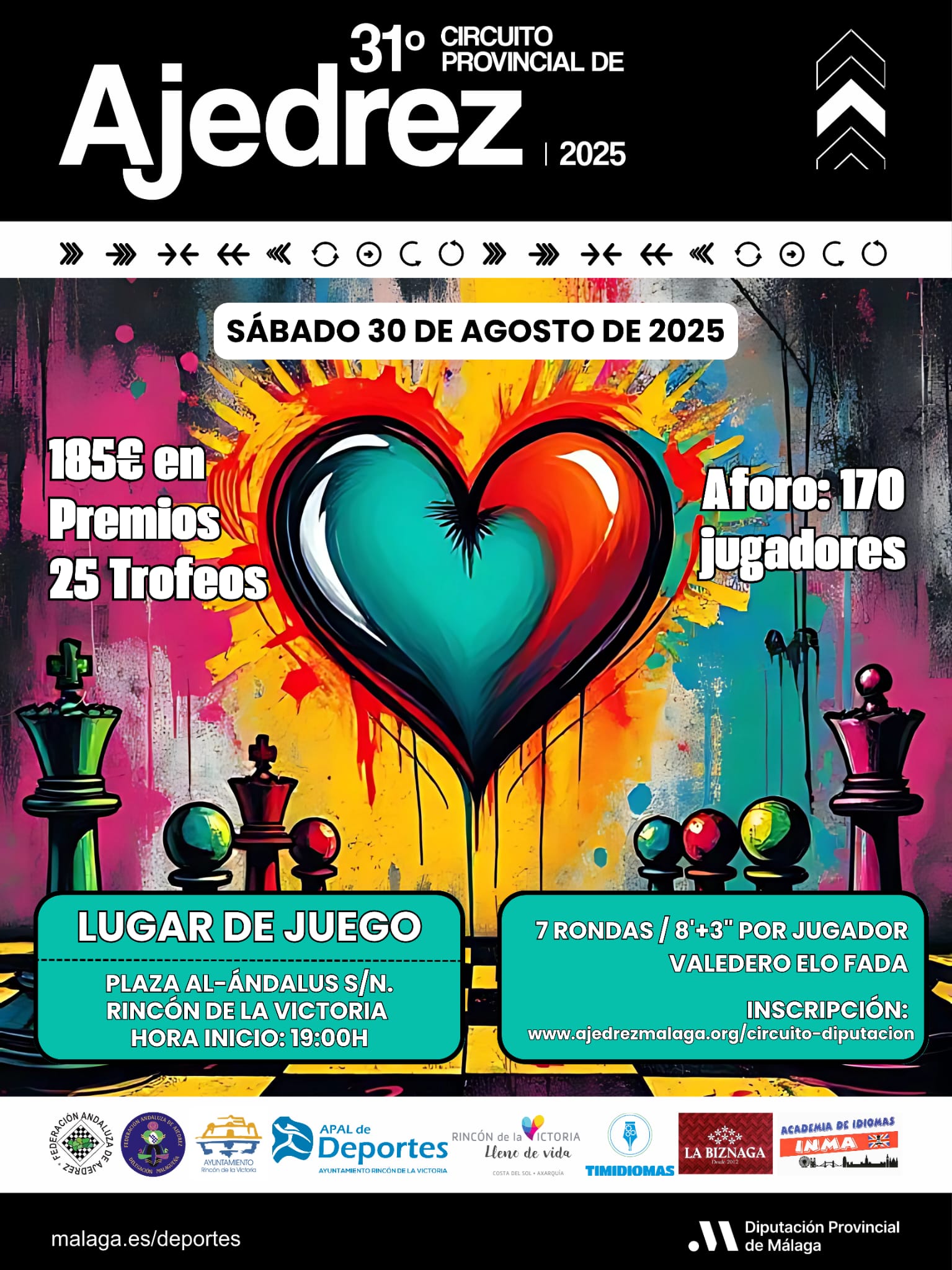 Las inscripciones estarán disponibles a partir del 8 de agosto en la web oficial del circuito:https://www.ajedrezmalaga.org/circuito-diputacion