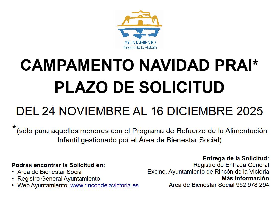 Desde el Área de Bienestar Social del Ayuntamiento de Rincón de la Victoria, continuando con su servicio de campamentos en periodos no lectivos, con el objetivo prioritario de dar continuidad al Programa de Refuerzo de la Alimentación Infantil y Primaria en los Centros Docentes Públicos en Andalucía, además de ofrecer un espacio de ocio y disfrute para los menores beneficiarios durante estas fechas, se ha abierto el plazo de inscripción para el Campamento PRAI de Navidad.