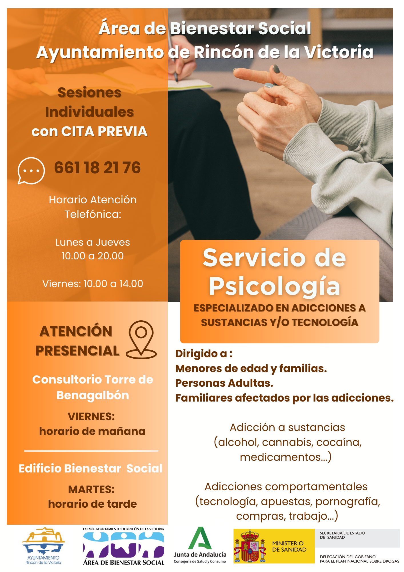Servicio de Psicología para personas con adicciones. Este recurso es gratuito para las personas empadronadas en el municipio de Rincón de la Victoria.