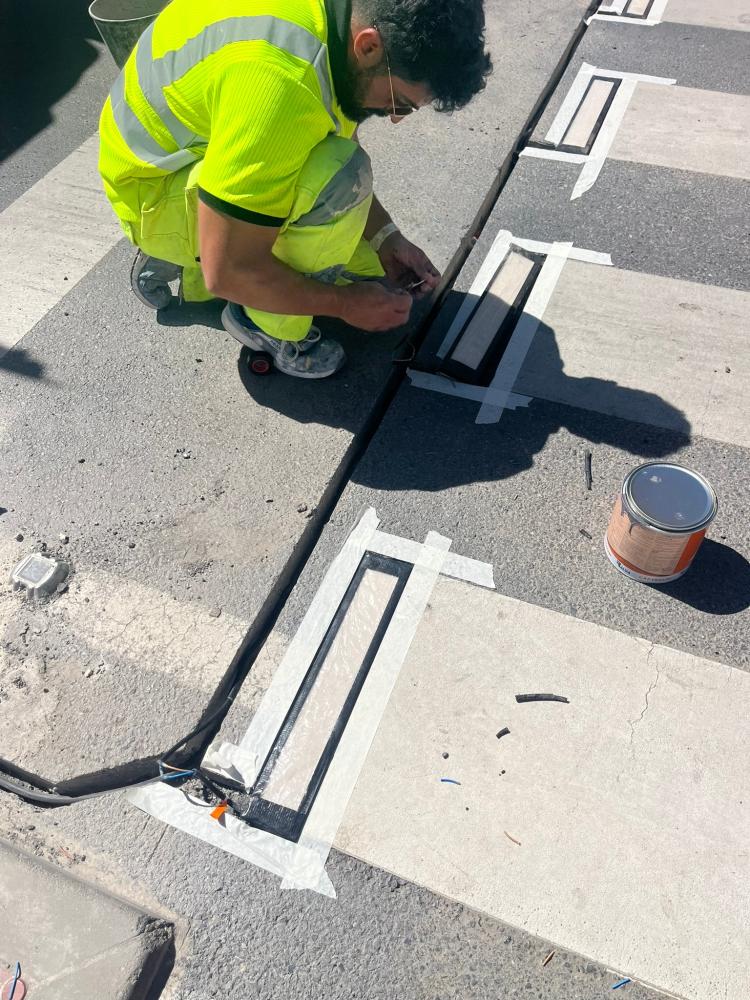 b) Instalación de pasos de peatones inteligentes iluminados en el suelo y con señalización vertical (8).