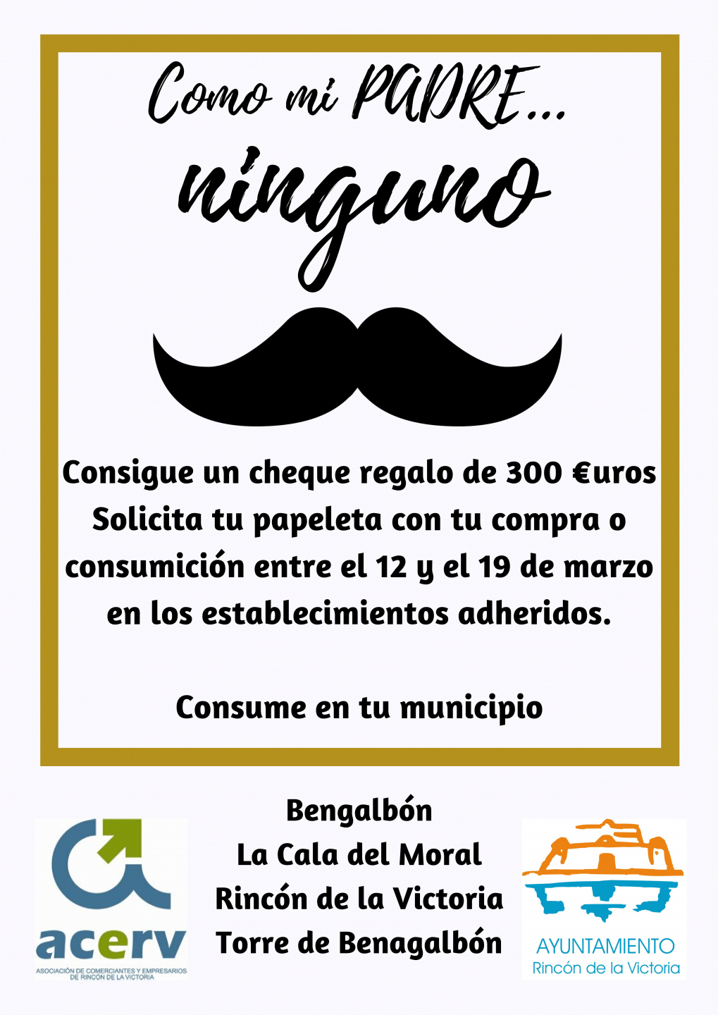Bajo el slogan `Como mi padre… ninguno´, la iniciativa tiene como finalidad “dinamizar el pequeño comercio de Rincón de la Victoria, además de incentivar las compras próximas a una fecha tan significativa para la actividad comercial como es el Día del Padre”, explica la edil del área, María de la Paz Couto (PP). La edil ha señalado que “continuamos con nuestro compromiso de apostar por diferentes acciones de promoción para impulsar la actividad comercial durante todo el año”.