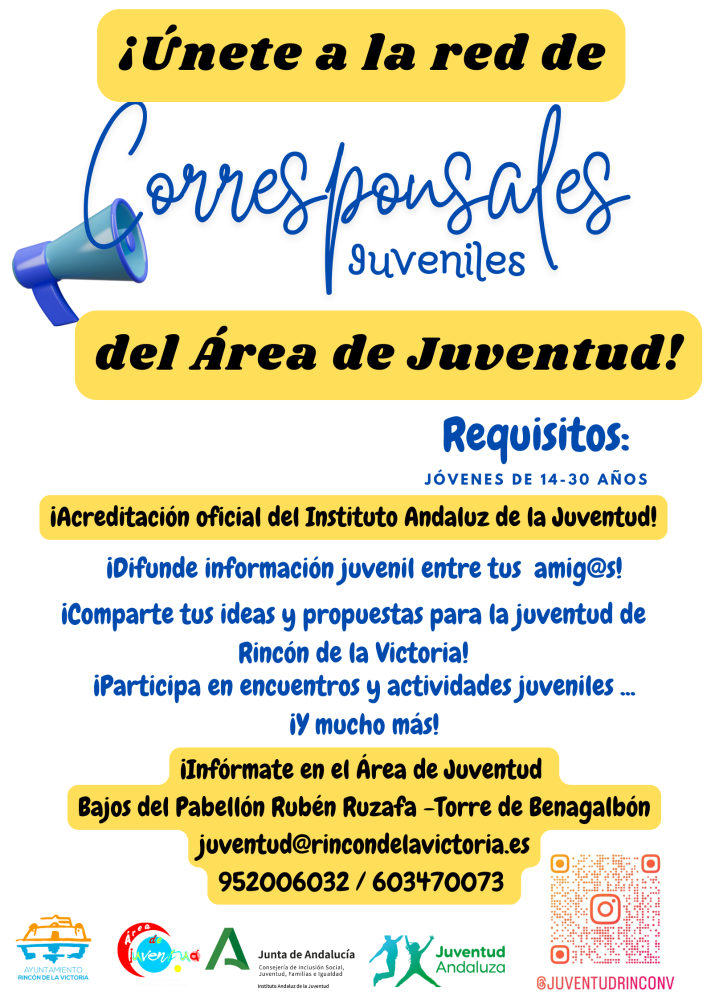 - Cumplimenta la hoja de solicitud que encontrarás en la sección DOCUMENTOS y, envíala, junto con una copia de tu DNI (por ambas caras) a juventud@rincondelavictoria.es, indicando en el asunto: "Solicitud de Corresponsal Juvenil".