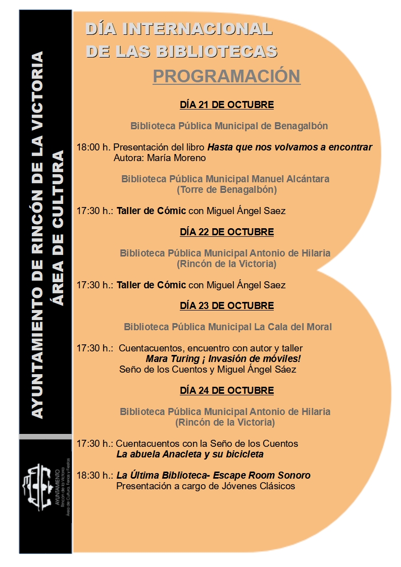 El Ayuntamiento de Rincón de la Victoria, a través del Área de Cultura, ha organizado una completa y variada programación de actividades para conmemorar el Día Internacional de las Bibliotecas, que tendrá lugar entre los días 21 y 24 de octubre en las bibliotecas públicas del municipio.