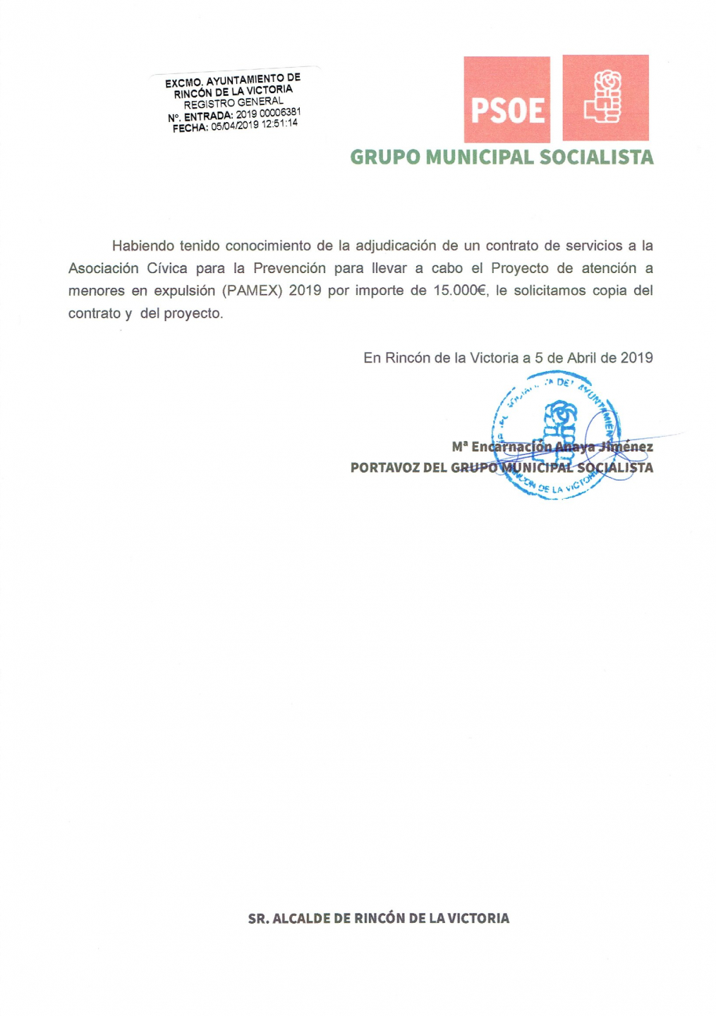 Habiendo sido adjudicado el proyecto sobre atención a menores en expulsión a la Asoc. Cívica para la Prevención, por importe de 15.000€, hemos solicitado copia del mismo.