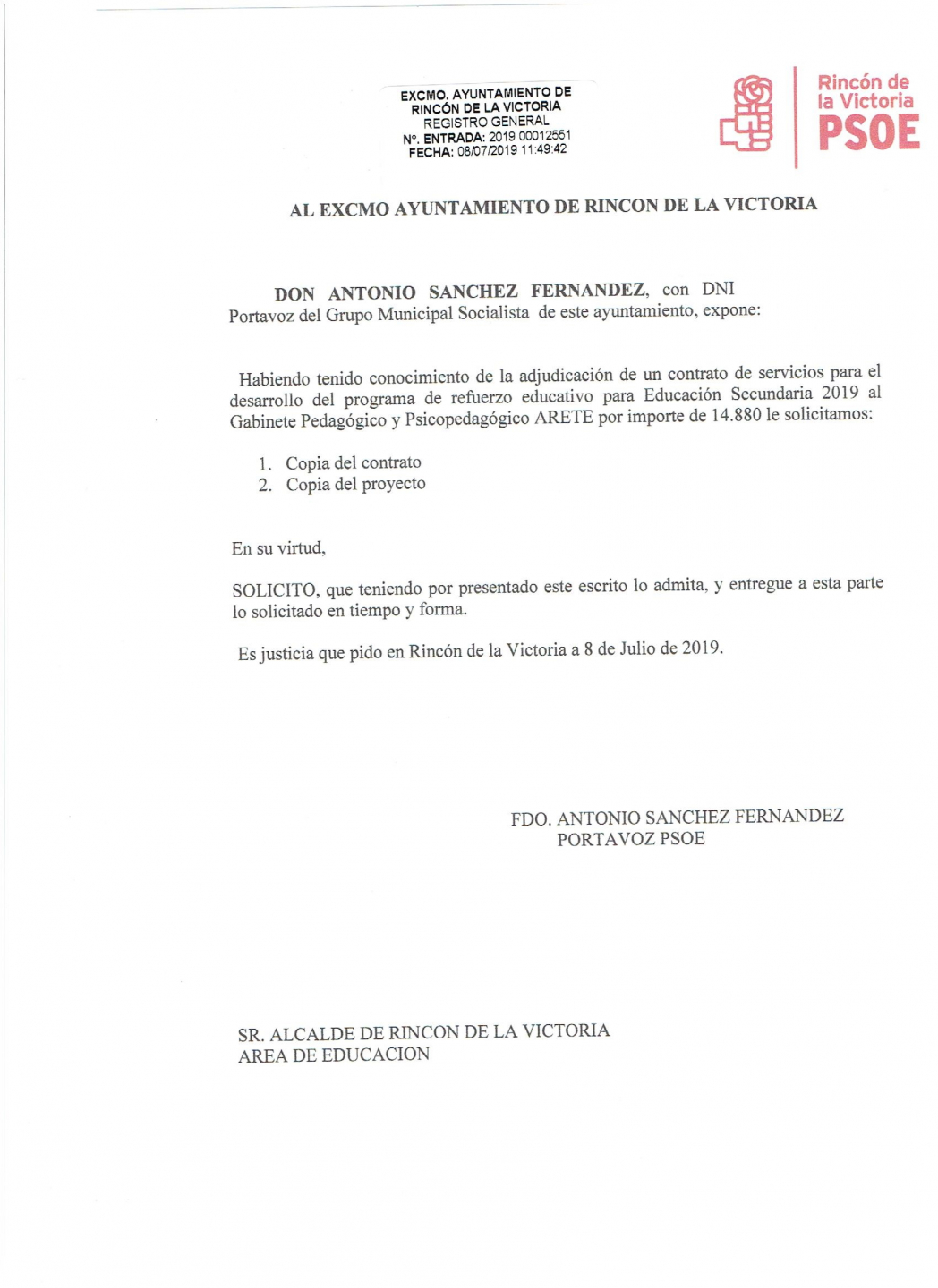 Solicitud copia del contrato de adjudicación de servicios a gabinete ARETE