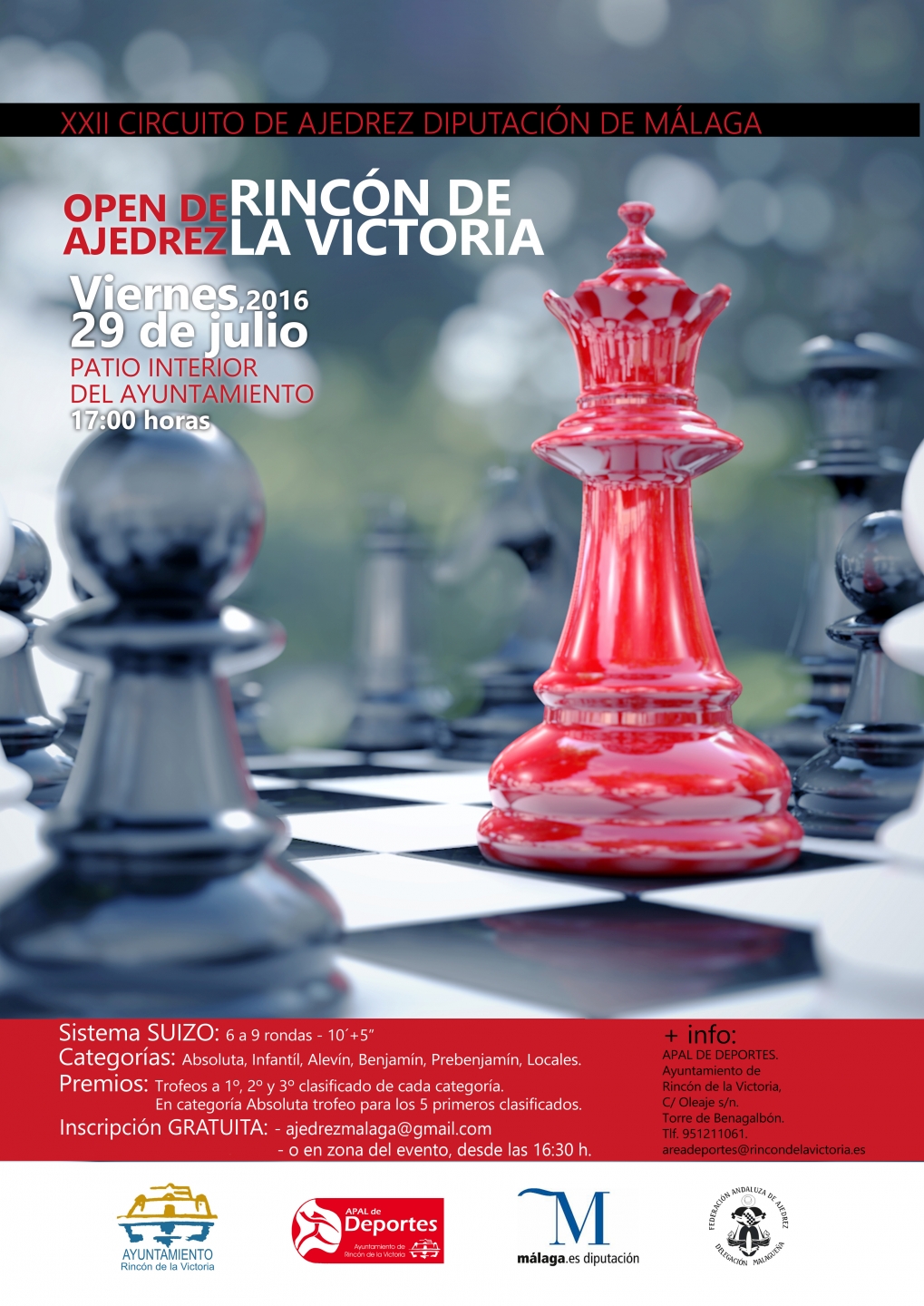 29 JULIO: XXII Circuito Provincial de Ajedrez: Open Rincón de la Victoria. A partir de las 17:00 h. en el patio del Ayuntamiento de Rincón de la Victoria. Inscripciones: ajedrezmalaga@gmail.com