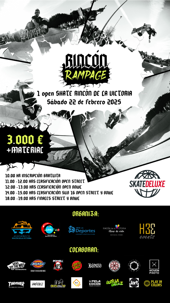 Rincón de la Victoria, 31 de enero de 2025: Hasta 3.000 euros en metálico y otros 500 euros más en material deportivo estarán en juego el próximo sábado 22 de febrero de 2025 en la primera edición del Open Internacional de Skate `Rincón Rampage´ que organiza el área de Juventud del Ayuntamiento de Rincón de la Victoria y que promueve H3 Events.