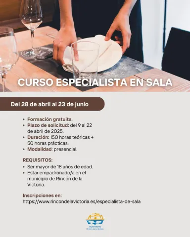 Las Concejalías de Empleo y Comercio del Ayuntamiento de Rincón de la Victoria han convocado un curso gratuito de `Especialista en Sala´ dirigido a personas desempleadas y trabajadores en activo que quieran mejorar su empleabilidad.