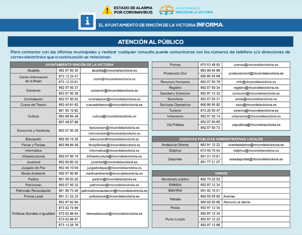 El Ayuntamiento de Rincón de la Victoria ha anunciado que a partir del lunes 25 de mayo reanudará la actividad presencial en sus servicios y dependencias municipales en horario de 09:00 a 13:30 horas de atención al público.